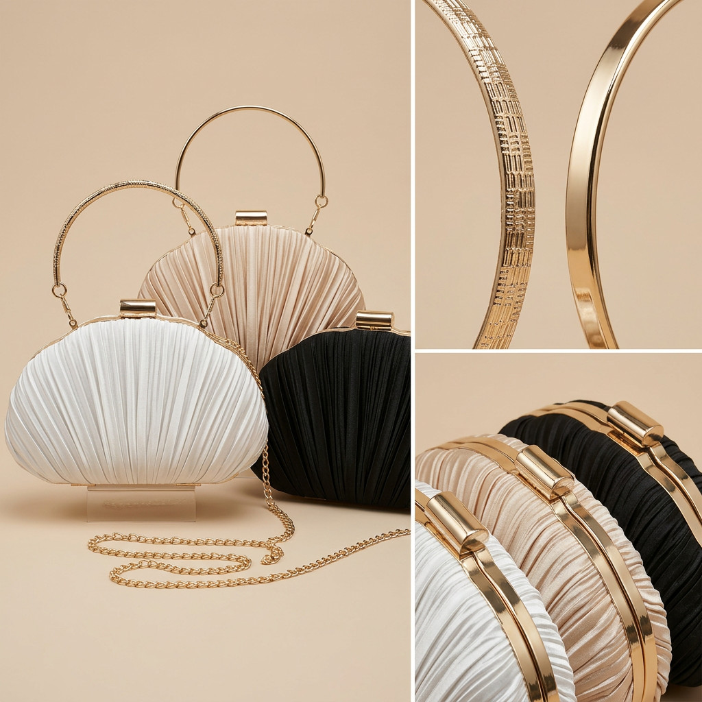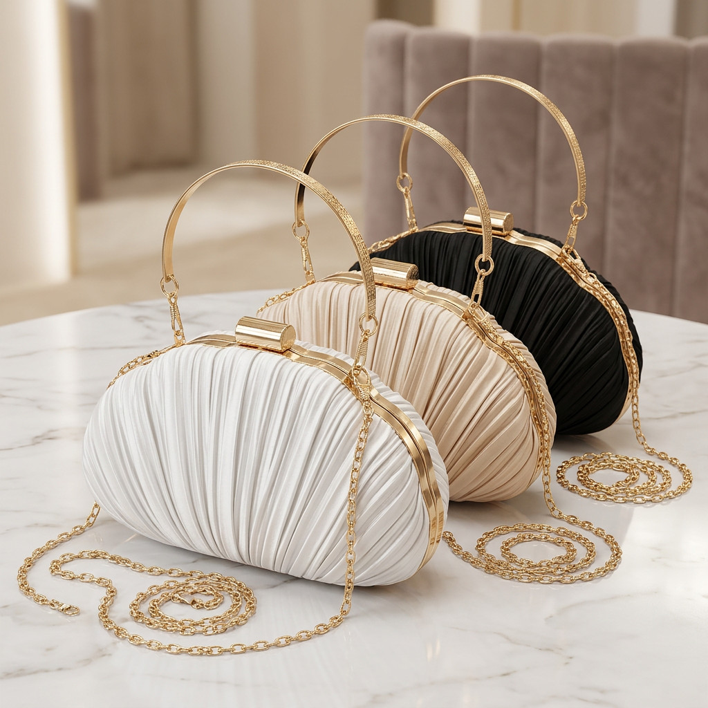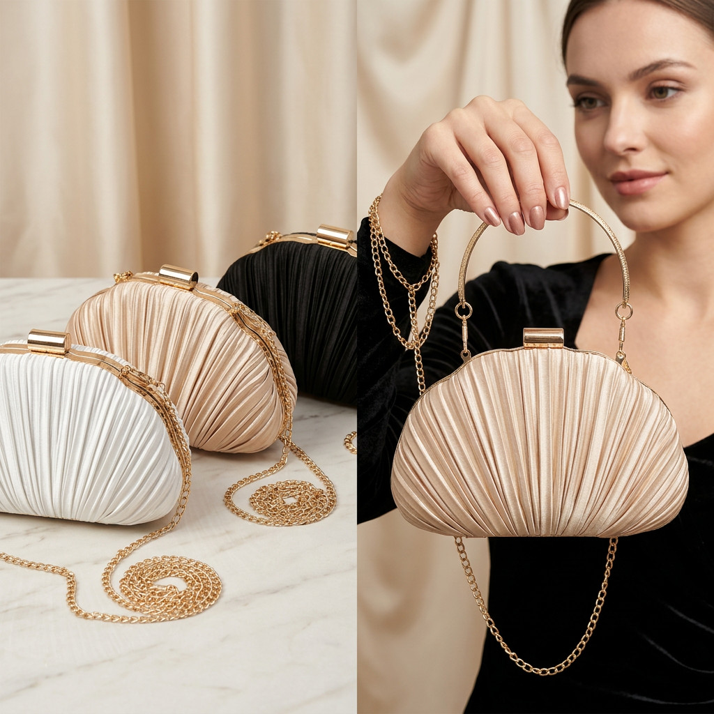Ez az alkalmi táska a klasszikus elegancia és a modern glamour tökéletes kombinációja. A finoman pliszírozott (redőzött) felület különleges textúrát ad, míg az arany színű fém keret és a karakteres kapcsos zár igazi luxus hatást kölcsönöz.