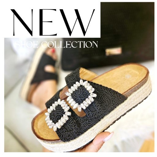 Ez a papucs a bohém és a glam stílus találkozása. A natúr, texturált felület és a fonott hatású talp a természetes, nyárias hangulatot idézi, míg a csillogó köves csatok egy csipet luxust visznek az összképbe.
