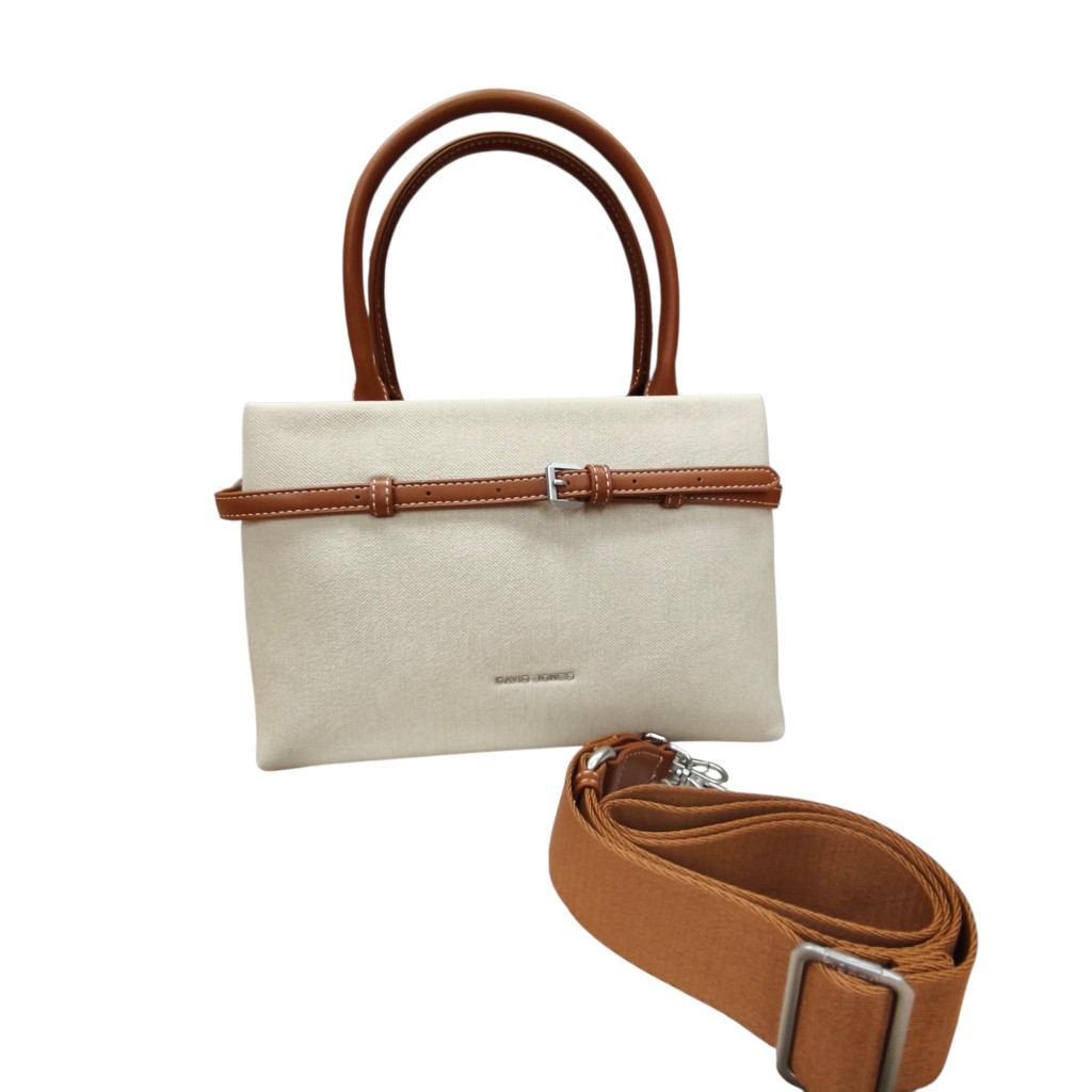 Elegáns, letisztult és természetes hatású darab a David Jones kollekcióból, amely tökéletes választás a hétköznapokra és az alkalmi megjelenésekhez egyaránt. A világos bézs textilhatású testet kontrasztos, barna műbőr részletek és dekoratív övcsat díszítés teszik különlegessé, amely kifinomult, nőies karaktert kölcsönöz a táskának.