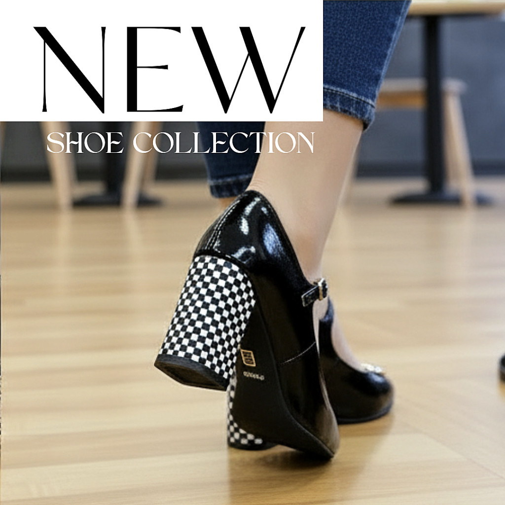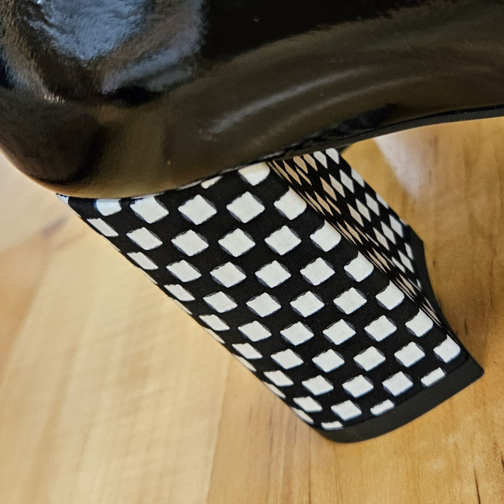A fényes prémium minőségű fekete bőr felsőrész klaszikus és kifinomult megjelenést biztosít, míg a kontrasztos, fekete-fehér sakktábla mintás vastag sarok karakteres és extravagáns megjelenést kölcsönöz. A cipő orrán található arany keretes sakktábla dísz pedig még inkább kiemeli az exkluzivitását.