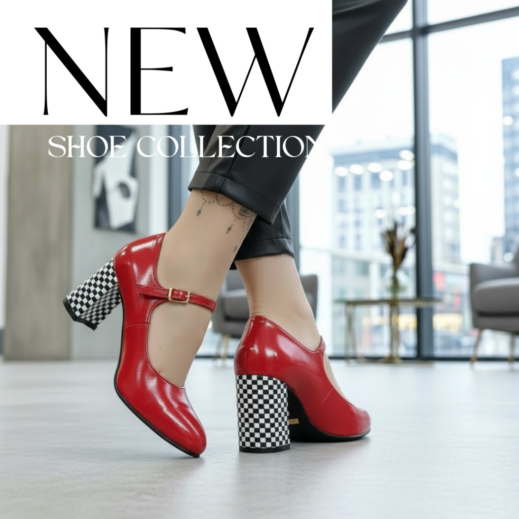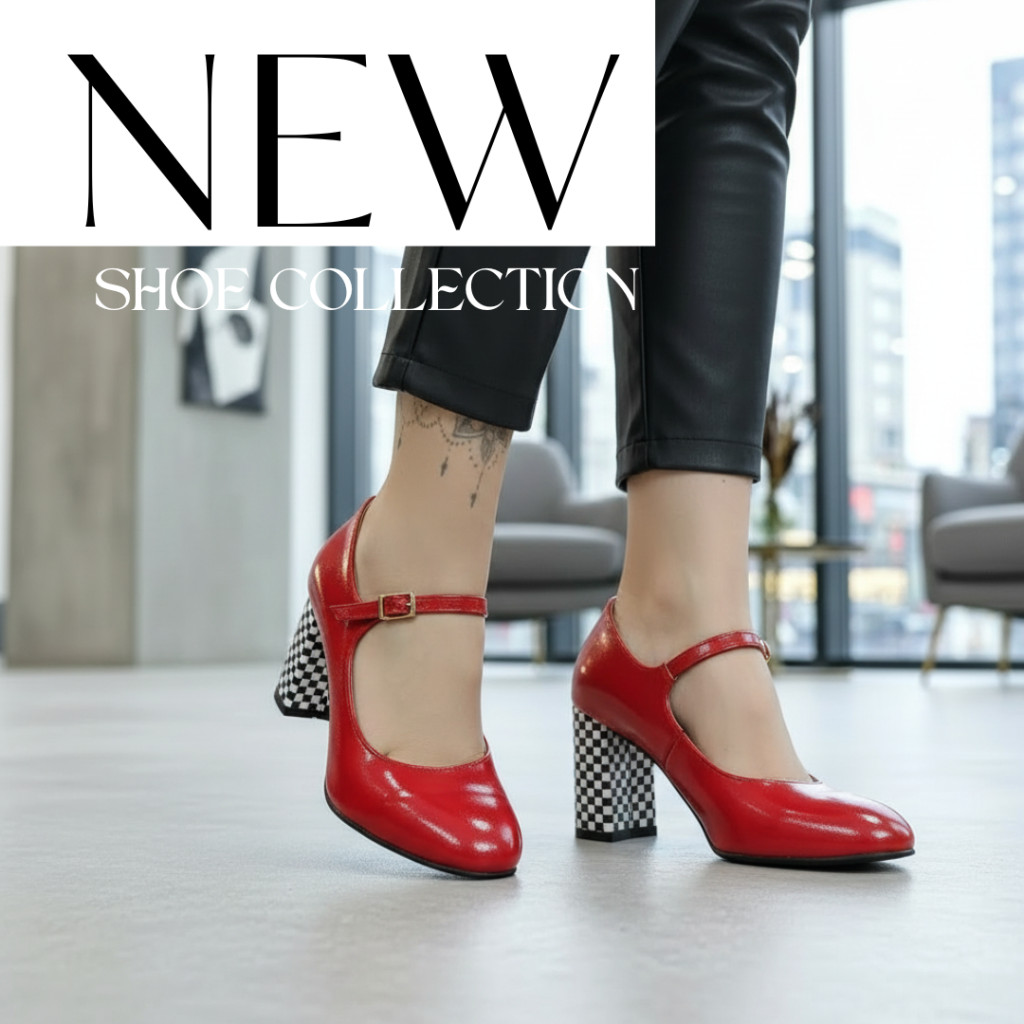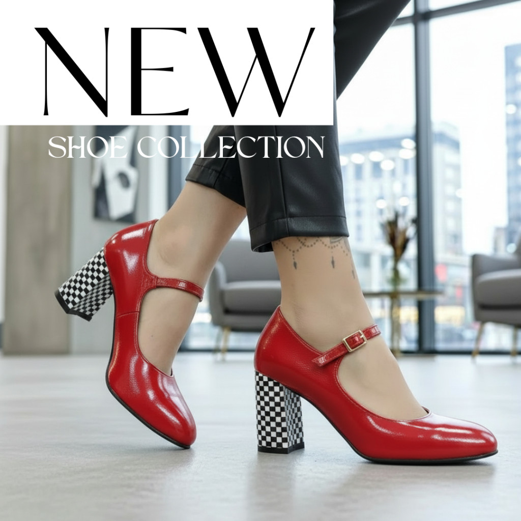 A fényes élénkpiros prémium minőségű bőr felsőrész merész és figyelemfelkeltő, míg a kontrasztos, fekete-fehér sakktábla mintáss vastga sarok karakteres és extravagáns megjelenést kölcsönöz.