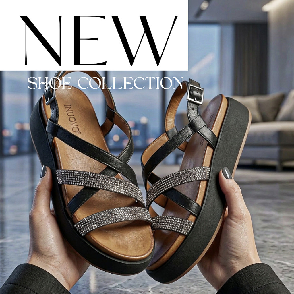 Az Inuovo platform talpas bőr szandál látványos, mégis elegáns választás a nyári szezonra. A fekete bőr felsőrész finoman követi a láb vonalát, míg a több vékony pánt nőies és légies megjelenést ad. A modell különlegességét a csillogó, strasszköves pántok adják, amelyek kifinomult fényt visznek az összhatásba, így ez a szandál azonnal feldobja az outfitet.