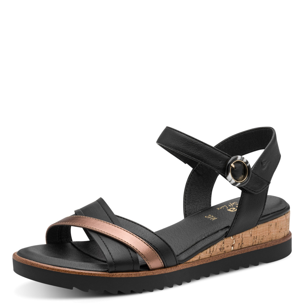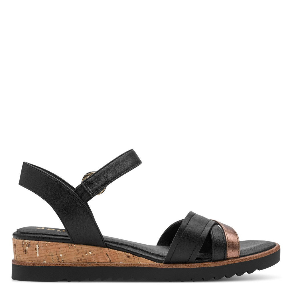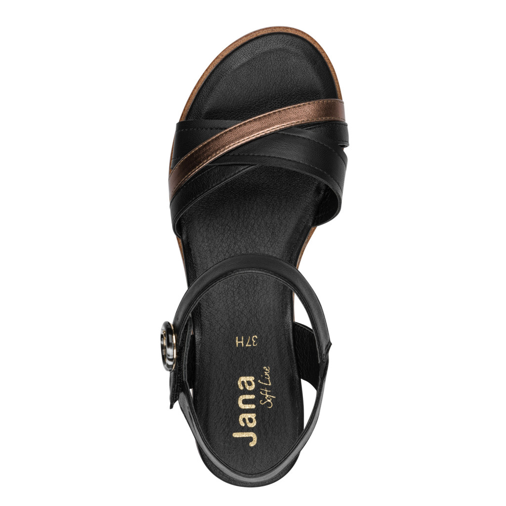 Ez a Jana kényelmi szandál a mindennapi komfort és a letisztult stílus tökéletes kombinációja. A klasszikus fekete alapot egy elegáns metál pánt dobja fel, így egyszerre visszafogott és különleges darab.