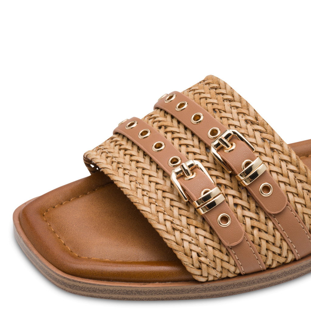 A dupla pántos kialakítást arany csatos díszítés teszi különlegessé, amely elegáns megjelenést ad a lazább fazonnak. A könnyű, lapos talp ideális városi használatra vagy nyári sétákhoz.