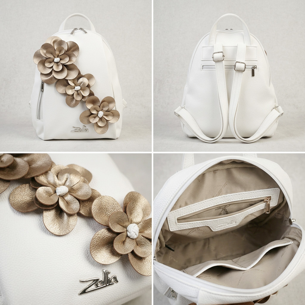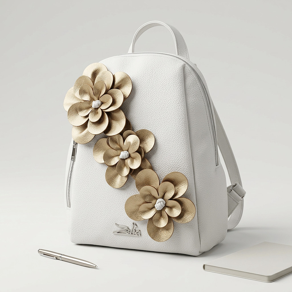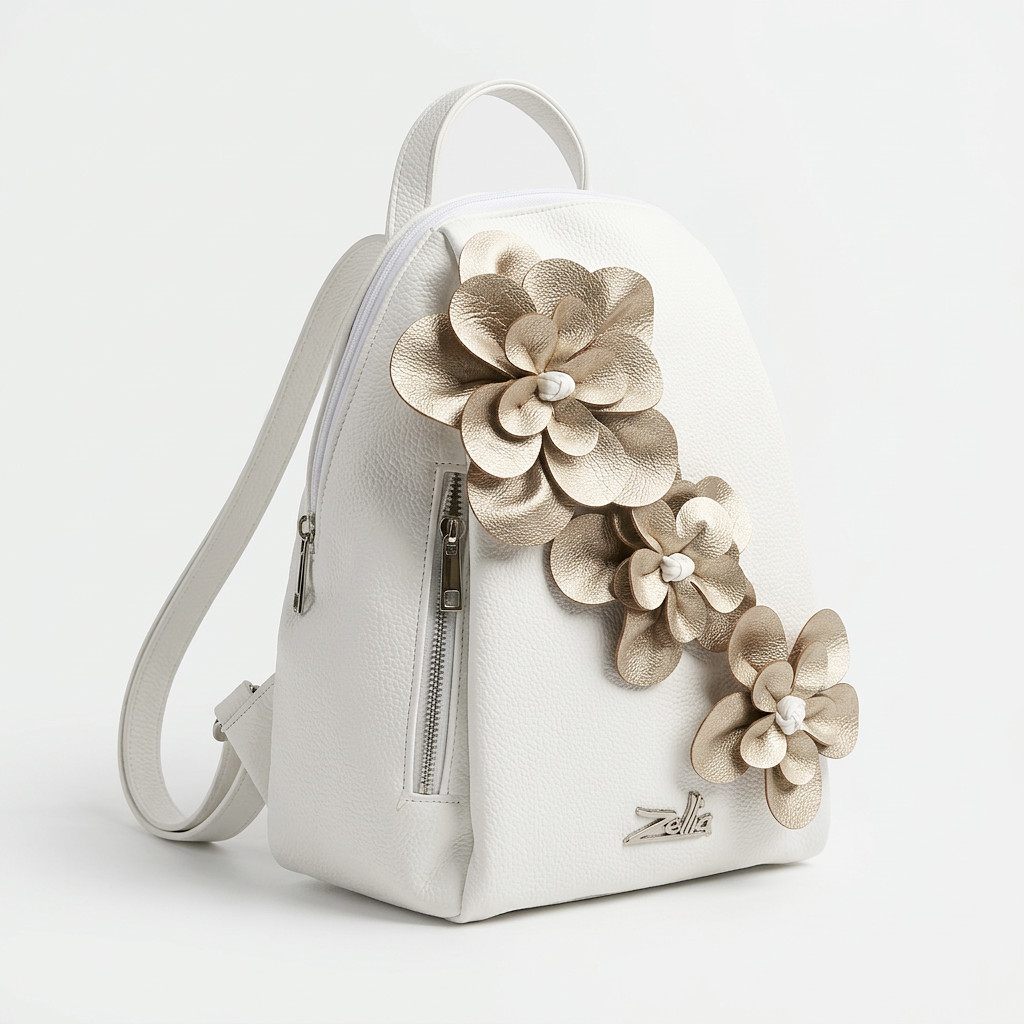 Ez a Zellia női hátitáska egy igazán különleges, elegáns darab, amely azonnal magára vonja a tekintetet. A letisztult fehér alapot gyönyörű, arany árnyalatú 3D virágdíszek teszik egyedivé, így a táska nemcsak praktikus, hanem valódi divatkiegészítő is.