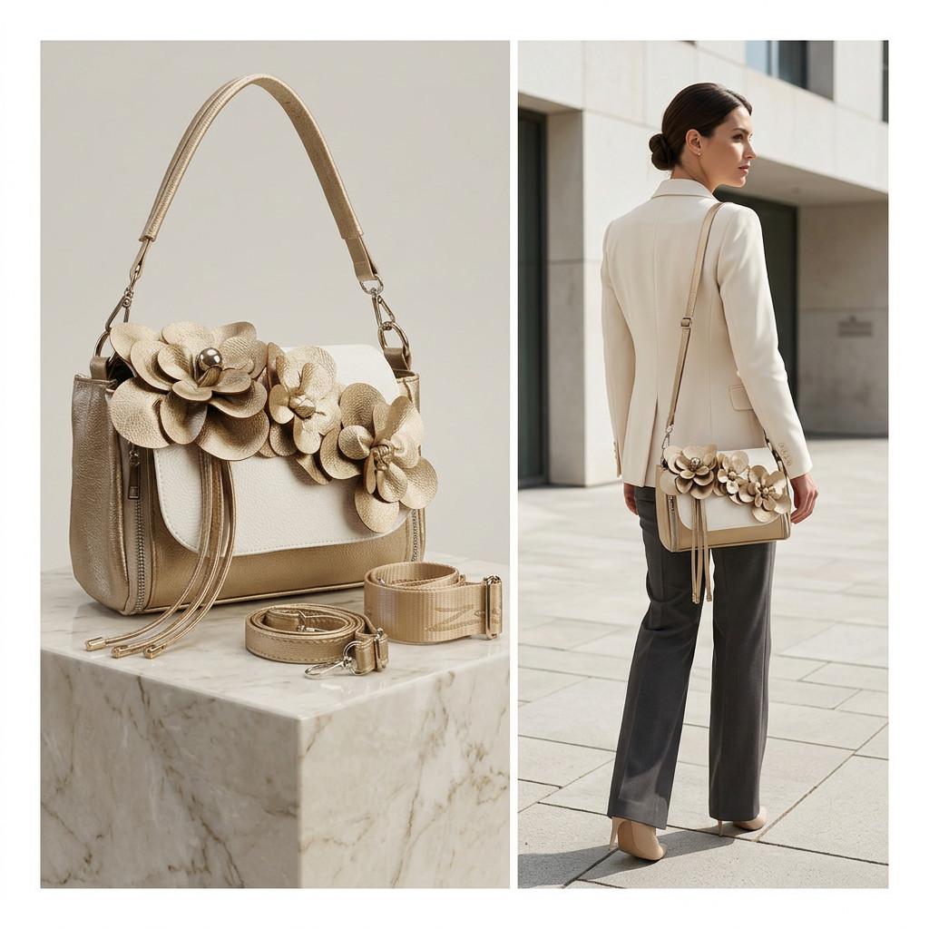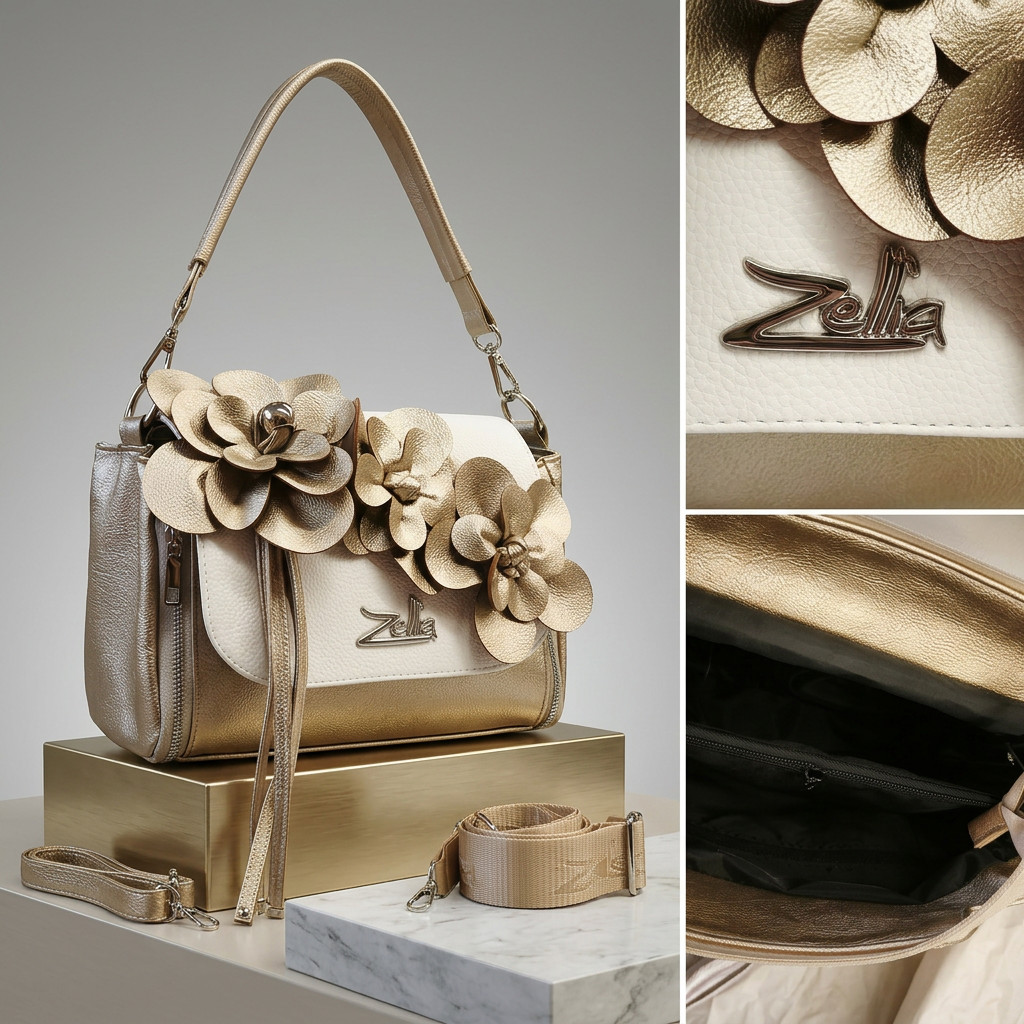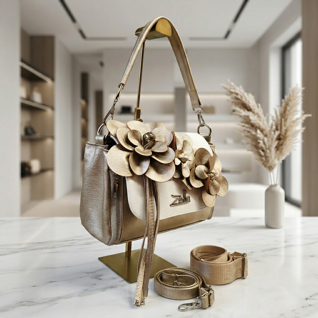 Ez a Zellia váll- és oldaltáska igazi ékszere lehet a megjelenésednek. Az elegáns arany és krém színkombinációt a látványos, térbeli virágdíszítés teszi igazán különlegessé, amely azonnal magára vonzza a tekintetet.